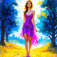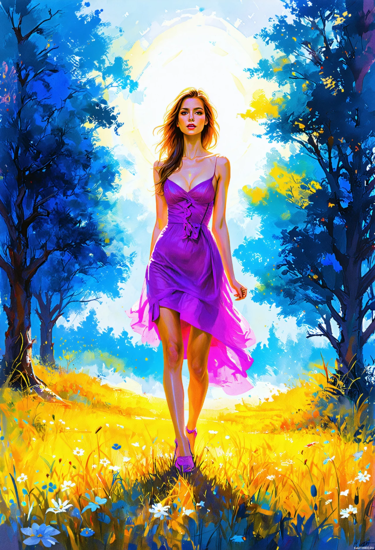 Женщина в фиолетовом платье с длинными, струящимися рукавами и вырезом "сердечко". Она запечатлена в фантастическом пейзаже, стоя на тропинке, обрамленной деревьями, под лучами солнца. На заднем плане – небо с облаками и сияющим солнцем в центре, что создает ощущение раннего утра или позднего вечера.