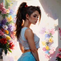 На картинке – трехмерная визуализация женского персонажа, снятая со спины. У нее длинные темные волосы, собранные в высокий хвост, джинсовые шорты с декоративным вырезом сзади, серый короткий топ и красная повязка на голову или резинка для волос. На заднем плане – цветочный орнамент с разноцветными цветами, справа – стол с растением. Слева – предмет, похожий на вазу или банку с декоративными элементами.