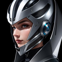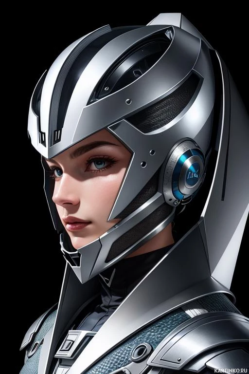 a high collar that seems to be part of her outfit, which is not fully visible due to the cropping of the image. The overall style of the image suggests a science fiction theme, as indicated by the futuristic helmet and the character's appearance.