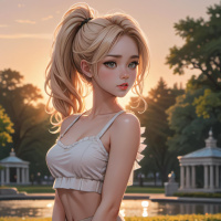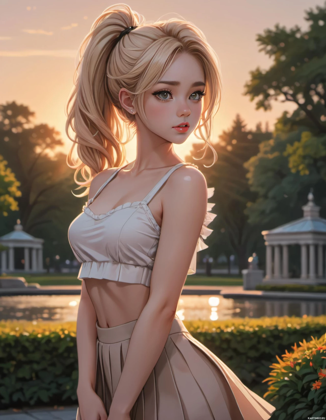 На картинке изображена девушка с длинными светлыми волосами, собранными в высокий пучок и украшенными, похоже, зеленой повязкой. На ней топ без рукавов с бахромой на шее и струящаяся бежевая юбка, ниспадающая к полу. Заходящее солнце заливает ее фигуру теплым светом, она стоит, грациозно положив руку на бедро, а другую слегка придерживая талию. За ней раскинулся большой газон, окаймленный деревьями, а на заднем плане, в сумеречном свете, виднеется классическое здание.