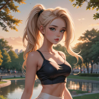 The image depicts a woman with blonde hair styled in a high bun, wearing a black and gray crop top and a skirt with embellishments. She is standing against a backdrop that appears to be an urban setting during what seems to be either sunrise or sunset, as indicated by the warm lighting. The woman's pose suggests she is posing for the photograph.