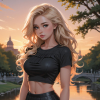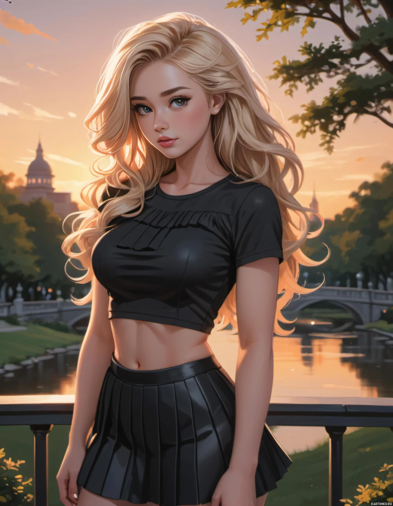 На картинке изображена женщина с длинными светлыми волосами. На ней чёрный кожаный топ и юбка, а также высокие чёрные ботинки. Макияж включает чёткие брови, выразительные скулы и нежный оттенок губ. Она уверенно стоит на фоне вечернего неба, за которым видны подсвеченные здания и деревья. Стиль картинки говорит о том, что это может быть концепт-арт или промо-материал для игры или подобного медиапроекта.
