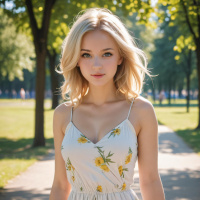 The image features a young woman standing in what appears to be an outdoor area with trees and grass. She has blonde hair styled straight, and her facial expression is neutral with a direct gaze towards the camera. The woman is wearing a sleeveless dress with a floral pattern of sunflowers on a light background. Her posture is relaxed, with one hand resting on her hip and the other by her side. The overall setting suggests a casual or summery ambiance.
