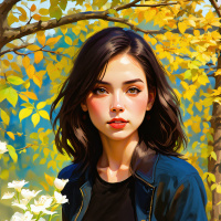 The image features a young adult female with shoulder-length dark hair. She has fair skin and her expression is neutral to slightly sad. Her makeup includes light pink lipstick. She is wearing a denim jacket over a black top. In her left hand, she holds a bouquet of white flowers. The background shows what appears to be a digital painting with a forest setting, featuring golden autumn leaves and a sunny atmosphere. The overall style suggests that this image may have been created digitally, potentially for artistic or promotional purposes.