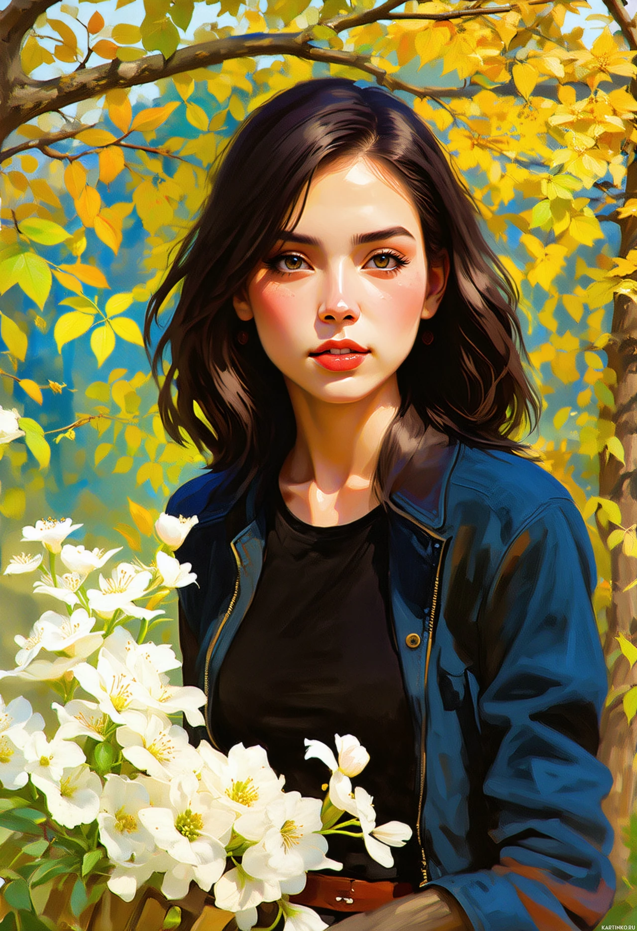 На картинке изображена молодая женщина с тёмными волосами до плеч. У неё светлая кожа, а выражение лица нейтральное, немного грустное. На губах нежно-розовый блеск для губ. Она одета в джинсовую куртку поверх чёрной водолазки. В левой руке она держит букет белых цветов. На заднем плане – что-то похожее на цифровую живопись: осенний лес с золотыми листьями и солнечное настроение. Общий стиль указывает на то, что картинка, вероятно, создана в цифровом формате, возможно, для художественных или рекламных целей.