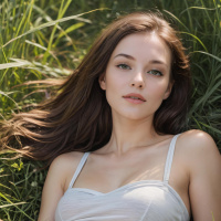The picture features a woman lying on her back in the grass. She has long hair and is wearing a top that appears to be off-white in color. The grass around her is green and she seems relaxed, possibly posing for the photo.