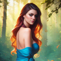 На картинке изображена женщина, сидящая на камне в, по всей видимости, лесистой местности. У неё длинные рыжие волосы и она одета в голубое платье с высокими каблуками. Выражение её лица нейтральное, и кажется, что она смотрит вдаль. Вокруг неё – деревья и мягкое свечение, которое освещает пространство.