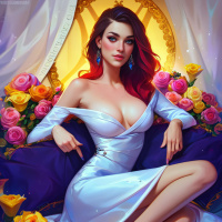 The image features a stylized female figure with long red hair adorned with gold accessories and large earrings, seated on a luxurious purple chair. She wears a strapless white dress with intricate detailing on the bodice and upper sleeves. Her posture is relaxed, yet elegant, with her hands resting lightly on her thighs. Surrounding her are an array of flowers, including roses, which contribute to a romantic or fairytale-like atmosphere. The setting appears to be indoors, possibly in a luxurious interior, suggested by the rich colors and textures visible in the background.