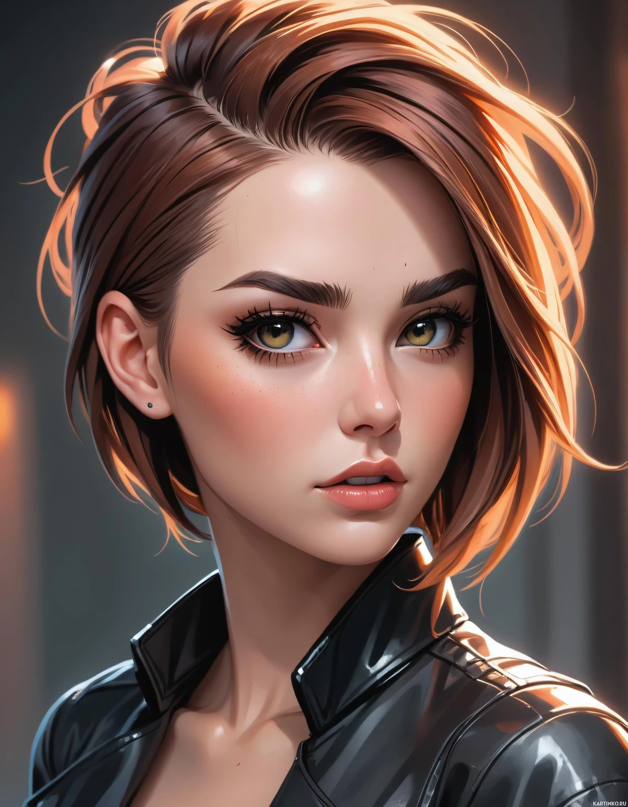 На картинке изображен стилизованный персонаж, похожий на молодую женщину с короткой каштановой стрижкой и макияжем, подчеркивающим глаза. У нее серьезное выражение лица, а на ней, кажется, черная кожаная куртка. Фон нейтральный, с легким теплым оттенком благодаря освещению. Черты лица персонажа гладкие и проработаны в реалистичной, но художественной манере, что указывает на цифровую графику или 3D-рендеринг.