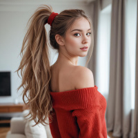 На картинке молодая женщина стоит в комнате, залитой естественным светом из окна справа. У нее длинные волосы, собранные в небрежный пучок, и она одета в красный свитер с круглым вырезом. Взгляд ее направлен в сторону, а выражение лица нейтральное. Вокруг нее в комнате видны предметы интерьера, такие как диван, и стена с настенными часами позади нее.