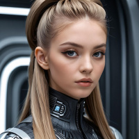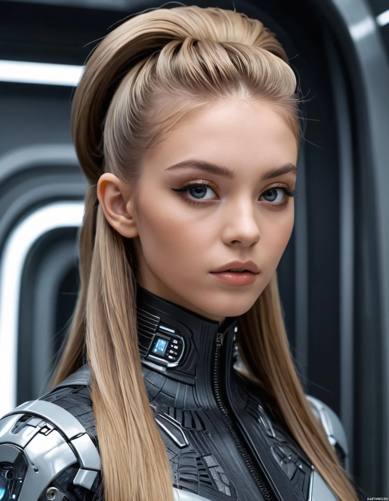 На картинке запечатлена молодая женщина с необычной внешностью, словно она играет роль персонажа в научно-фантастическом мире. У неё длинные прямые светлые волосы, ниспадающие на плечи и спину. Её выражение лица нейтральное, взгляд направлен немного в сторону. На ней футуристичный доспех, включающий чёрный комбинезон с металлическими элементами и ремнями. Доспех имеет глянцевую текстуру и кажется сложенным из нескольких слоёв и панелей. Общее настроение картинки – мрачное и футуристическое, с акцентом на создание атмосферы, намекающей на научно-фантастический сюжет.