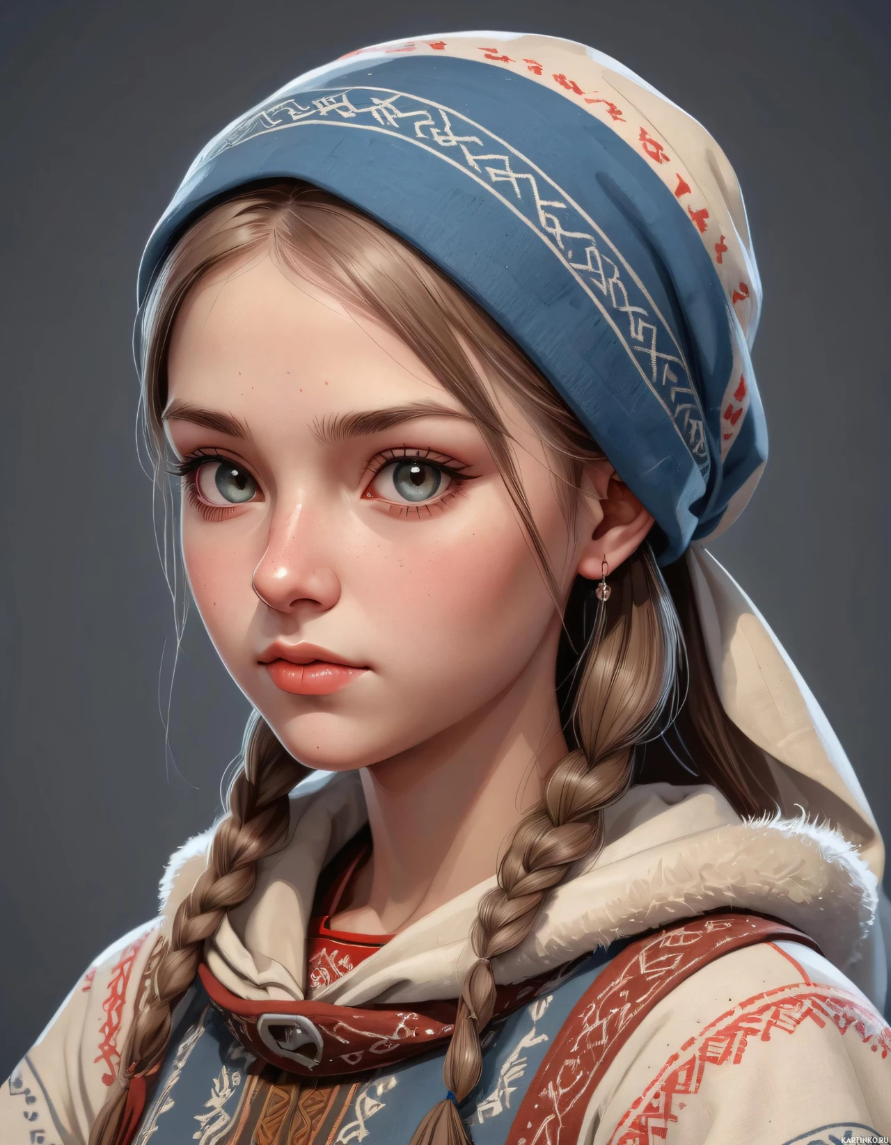 blonde hair styled in a braid on one side and her expression is neutral, giving the impression that she might be deep in thought or simply observing something out of frame. She wears a traditional-looking headdress adorned with