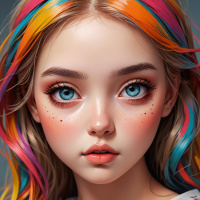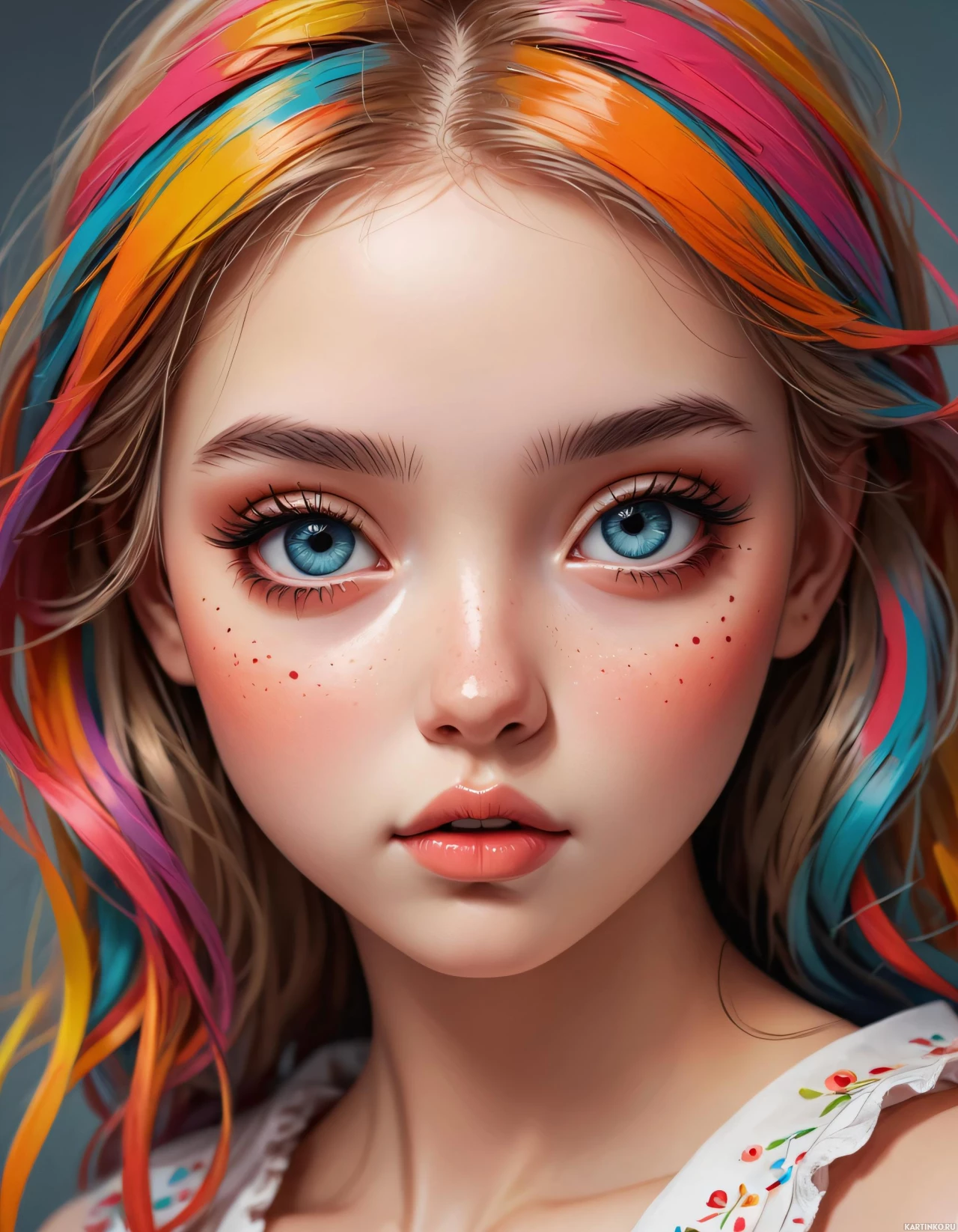 На картинке изображен человек с яркими, разноцветными волосами, в которых переливаются оттенки розового, голубого и желтого. Кожа светлая, с легким макияжем, подчеркивающим глаза. Видно, что кожа чистая, с заметными веснушками на носу и щеках. У человека пухлые губы и слегка приподведенные брови. Он смотрит прямо в камеру с нейтральным выражением лица. Свет акцентирует текстуру волос и блеск кожи.