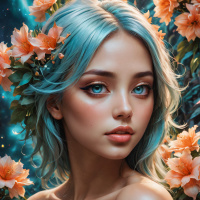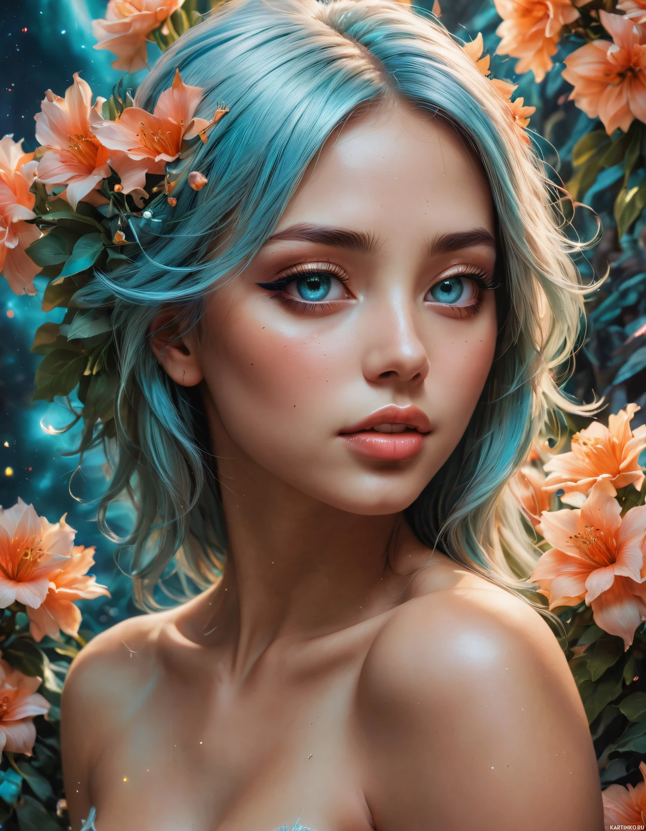 На картинке изображен стилизованный персонаж с бирюзовыми волосами на фоне темного пространства, окрашенного в синие и черные тона. У персонажа проработанное лицо с большими выразительными глазами, пухлыми губами и небольшим носом. На голове у него венок из оранжевых цветов, а на плечах – несколько листьев. Кожа светлая, с легким румянцем на щеках. Общий стиль картинки – цифровая живопись в фэнтезийной эстетике.