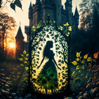 На картинке изображена силуэт девушки, идущей по тропинке и смотрящей вперёд. На ней платье, украшенное природными мотивами и звёздами. За ней возвышается богато украшенный замок с множеством шпилей и башен, на фоне бурного неба. На переднем плане – большая арочная дверь, украшенная листьями и освещенная тёплым, мерцающим светом, исходящим изнутри. Земля усыпана опавшими листьями, что говорит о наступлении осени. Солнце, кажется, садится или поднимается за замком.