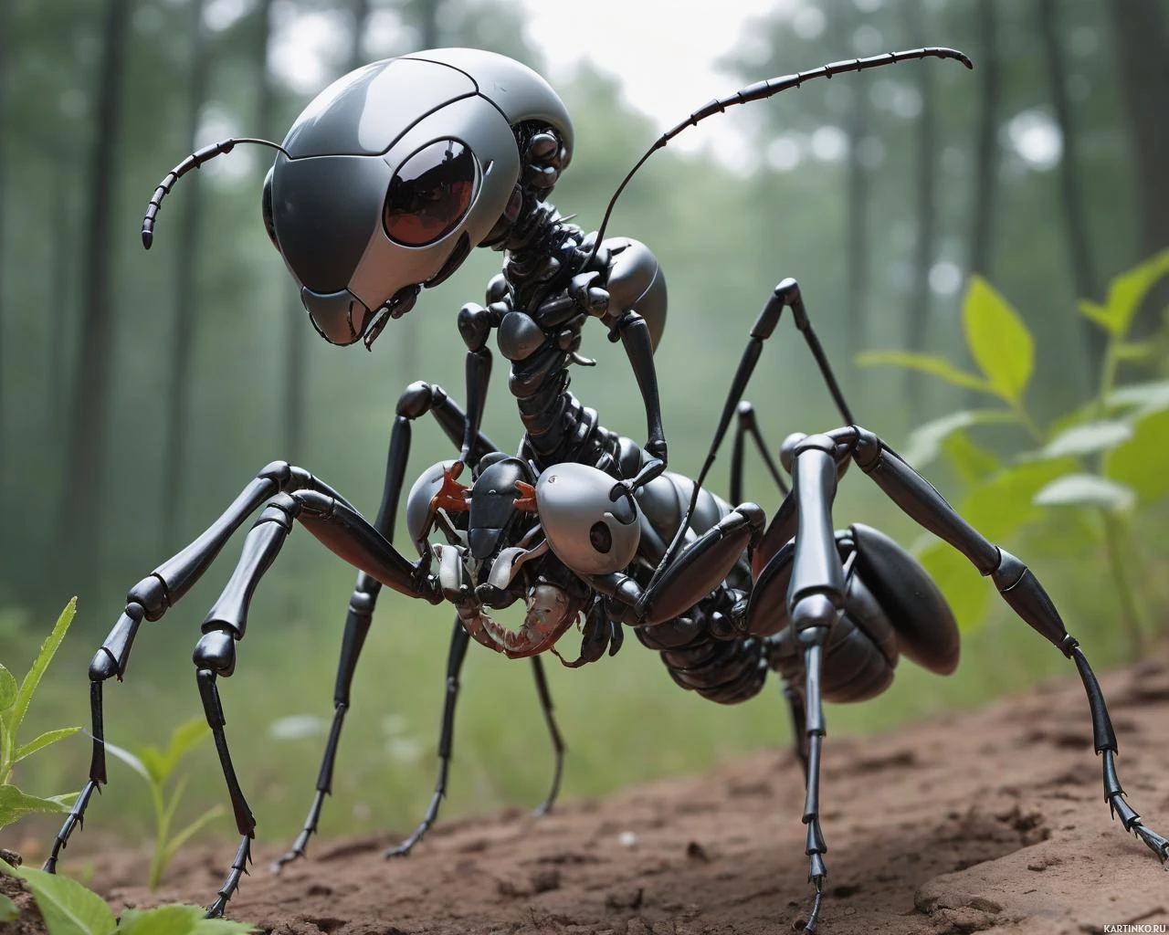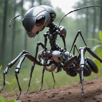 a science fiction scene featuring a robot that appears to be a mechanical insect. The robot has multiple
