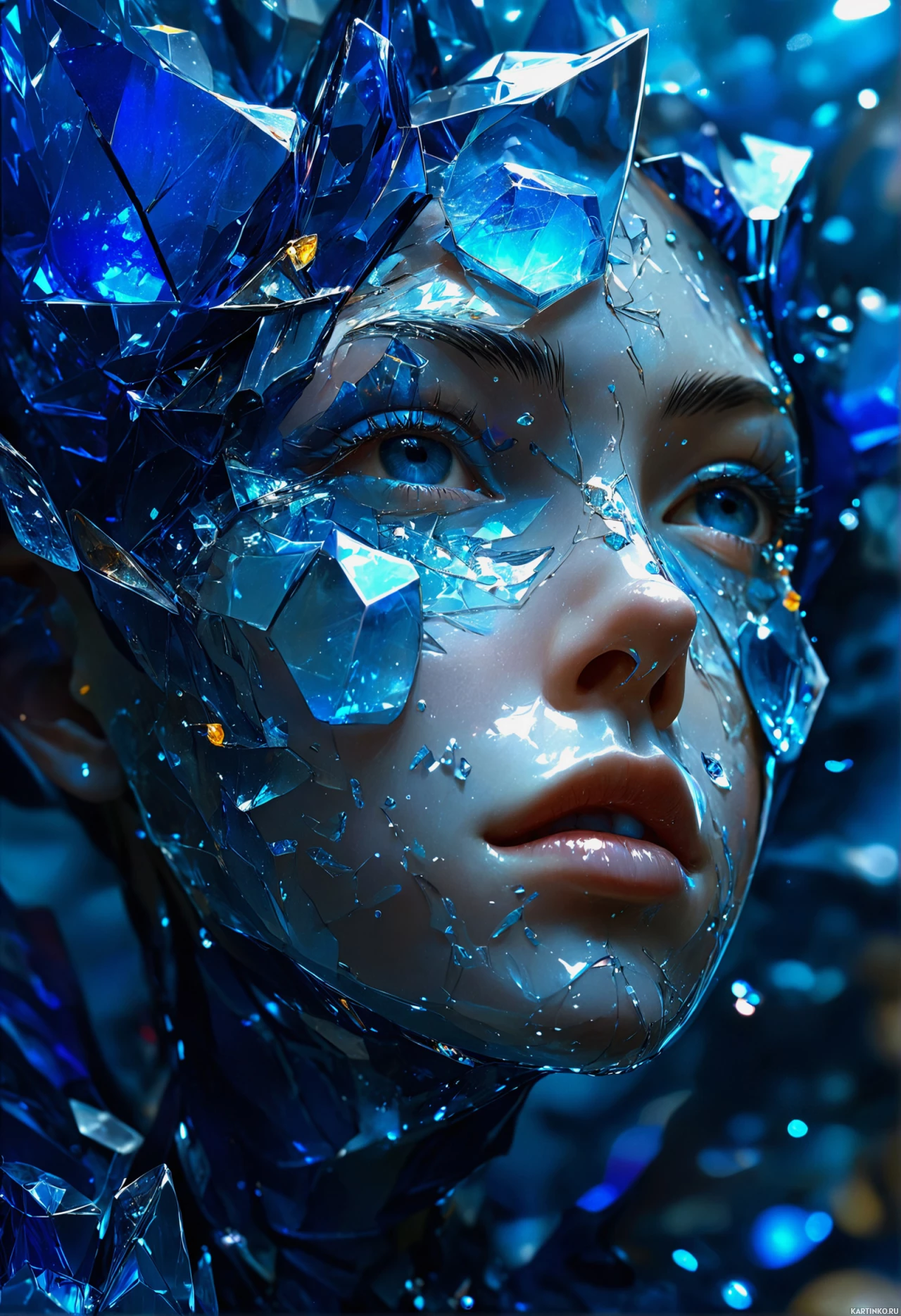 На картинке изображена фигура, похожая на человека, с выразительными чертами, намекающими на кибернетическое или роботизированное улучшение. У неё лицо с голубыми глазами и проработанными деталями, но на части лица наложены элементы, напоминающие металл, что придает ей несколько футуристичный вид. Губы слегка приоткрыты, словно в процессе речи или коммуникации. Голову украшают замысловатые узоры, похожие на кристаллические образования или архитектурные проекты, усиливающие общее фантастическое и неземное ощущение картинки. Заметны цветовые переходы на лице, от более светлого голубого вокруг глаз до более темных оттенков к центру лица. Фон приглушенно освещен, с мелкими светящимися точками или частицами, которые можно интерпретировать как звезды или искры, создавая эфирную и волшебную атмосферу. Общий стиль картинки сочетает реалистичные человеческие черты с элементами фантазии, создавая эстетику, близкую к научной фантастике или спекулятивному искусству.