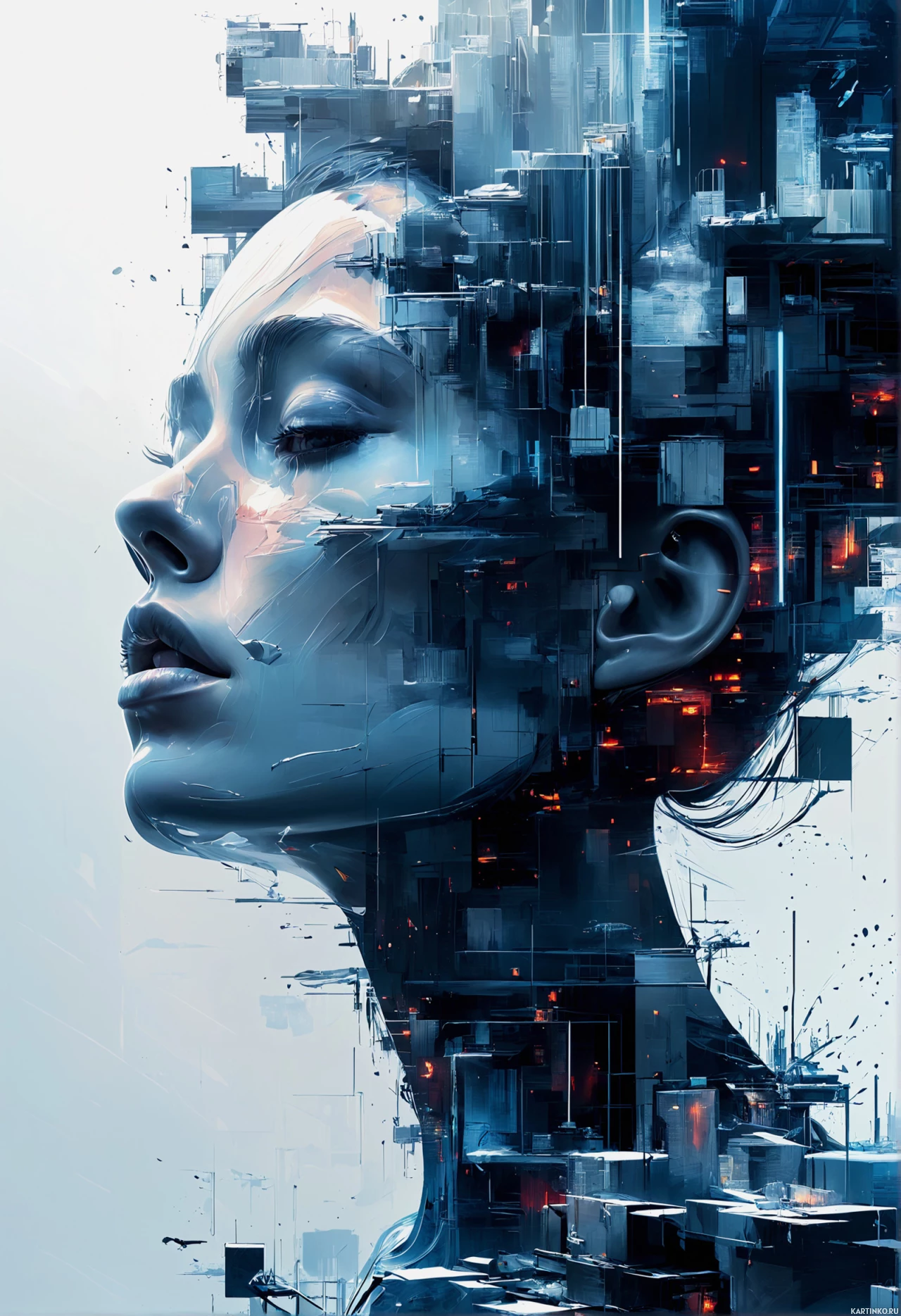 На картинке изображен профиль женщины, взгляд которой устремлен вниз на элементы, похожие на механизмы или технологии, интегрированные в ее голову и плечи. На ее лице задумчивое выражение и легкая улыбка. Фон темный, напоминает абстрактное представление городского пейзажа или промышленного окружения.
