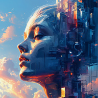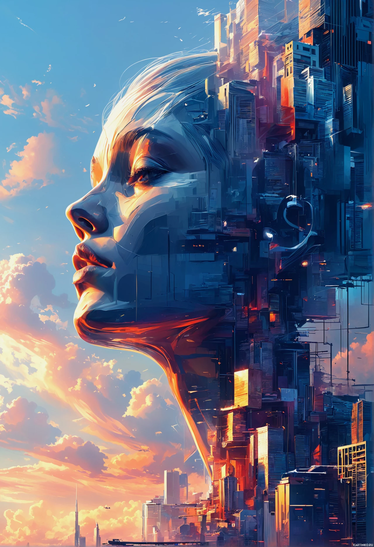 На картинке – стилизованное изображение женского профиля в центре, её глаза смотрят прямо, губы слегка приоткрыты. Вокруг головы – сложная конструкция, напоминающая башню или небоскреб, собранную из цифровых и технологических элементов: экранов, схем и, похоже, точек данных. Башня устремляется вверх, сливаясь с фоном, где переходит в городской пейзаж на закате. Небо переходит от тёплых оттенков у горизонта к более холодным тонам по мере подъема.