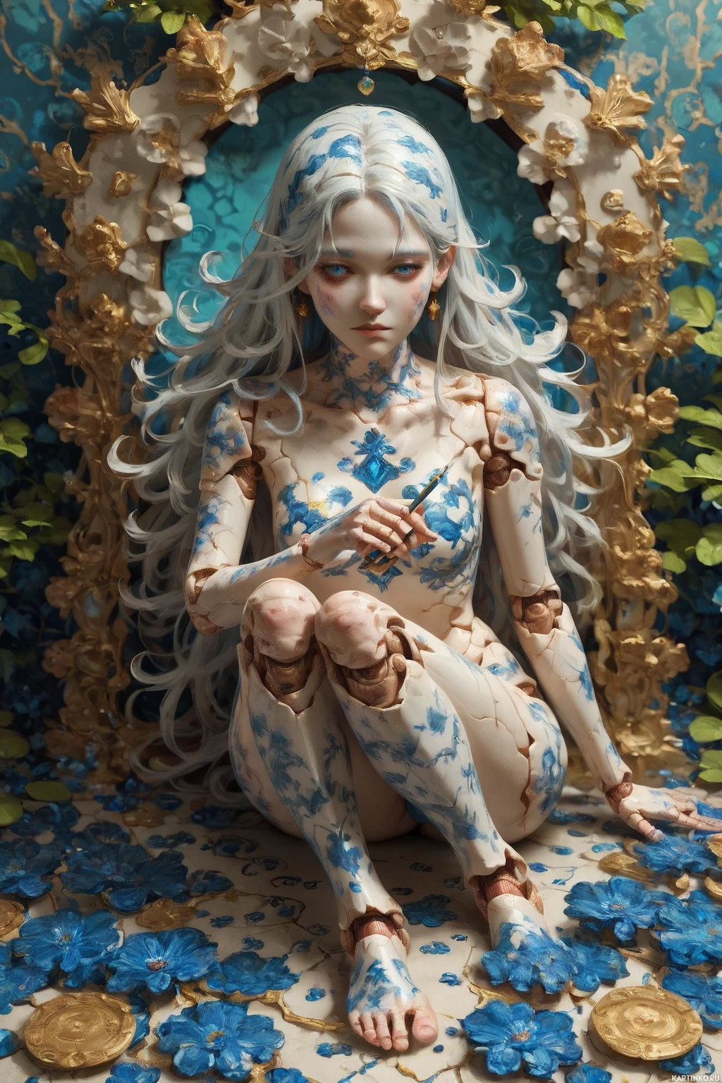 На картинке изображена фигура с белыми волосами, сидящая и смотрящая прямо на зрителя. Тело украшено сложным орнаментом, включающим синие узоры, которые можно интерпретировать как татуировки или роспись в традиционном азиатском стиле. Фон декоративный: синий, обрамлён золотой рамой, украшенной цветами и листьями в сине-зелёных тонах. Фигура опирается на одно колено, другая нога вытянута назад, руки покоятся на бёдрах. Общий стиль картинки – фантастический, с нотками классики, заметными в деталях дизайна и цветовой палитре.