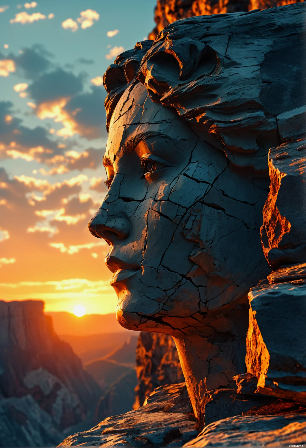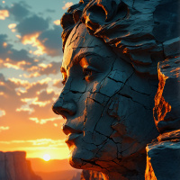 На картинке — профиль головы, словно изваяние, на фоне яркого заката с облаками и горами. Человек, кажется, смотрит вдаль, что придает композиции задумчивый, созерцательный характер. Теплые оттенки неба переходят от оранжевого к желтому, а затем к глубокому синему, уходящему к горизонту.
