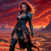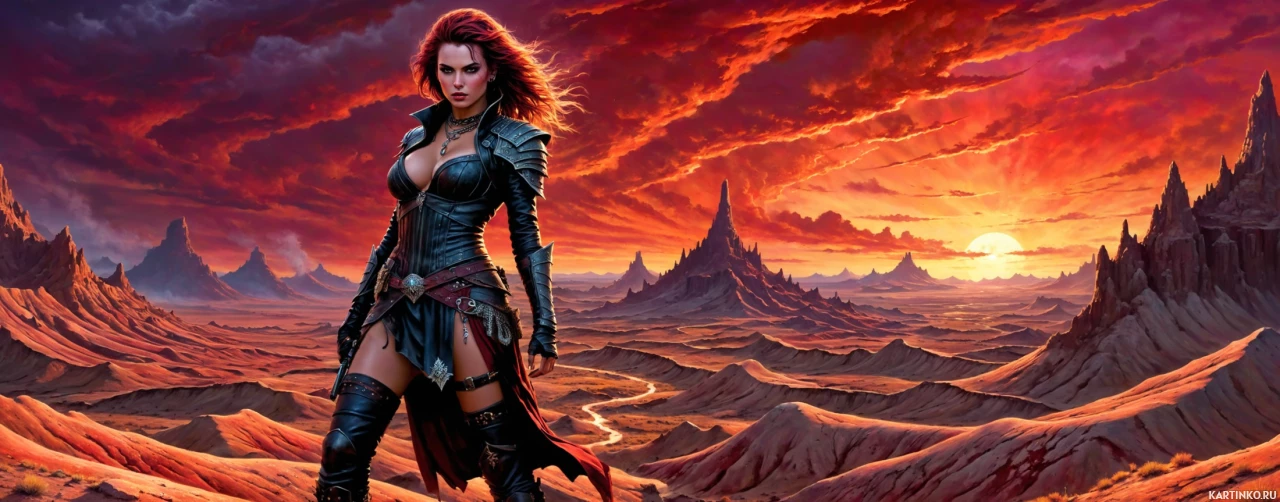 На картинке изображена персонаж, стоящая в неземном пейзаже во время заката, судя по тёплым оттенкам неба и золотому свету на горизонте. У неё рыжие волосы, она одета в доспехи тёмных тонов и плащ, сочетающийся с цветом волос. Она повернута к зрителю с решительным выражением лица. На заднем плане видны скалистые выступы, которые создают ощущение безжизненной, возможно, вулканической местности, подчёркнутой огненным небом.