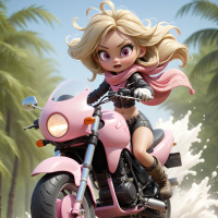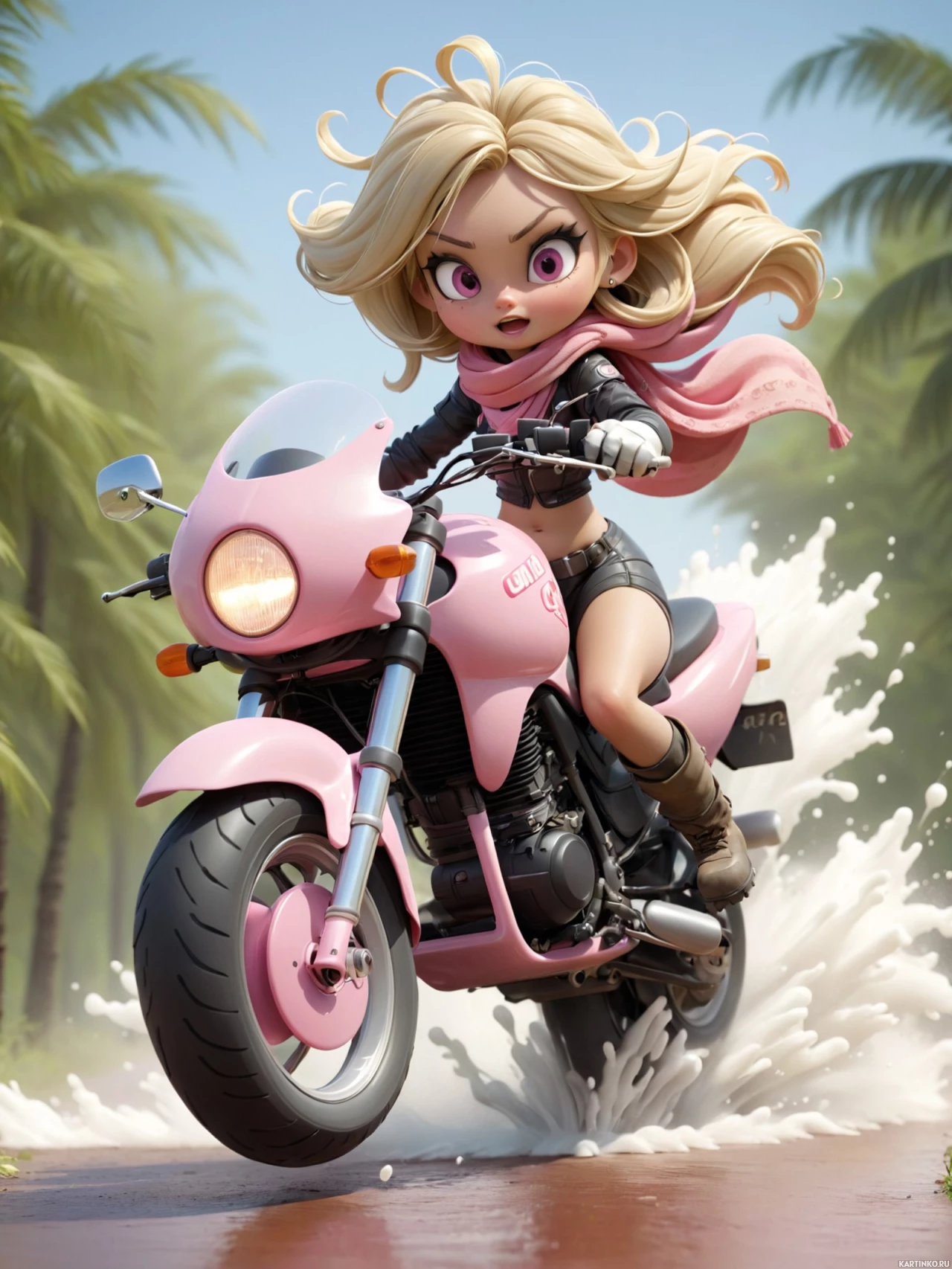 The image features a character riding a pink motorcycle. The character appears to be a young female with blonde hair, wearing a black top and scarf. She is in motion, as suggested by the water splashing around her from the tires of the motorcycle. The background shows lush greenery characteristic of tropical settings.