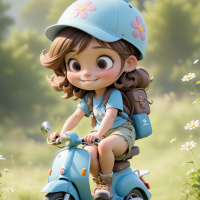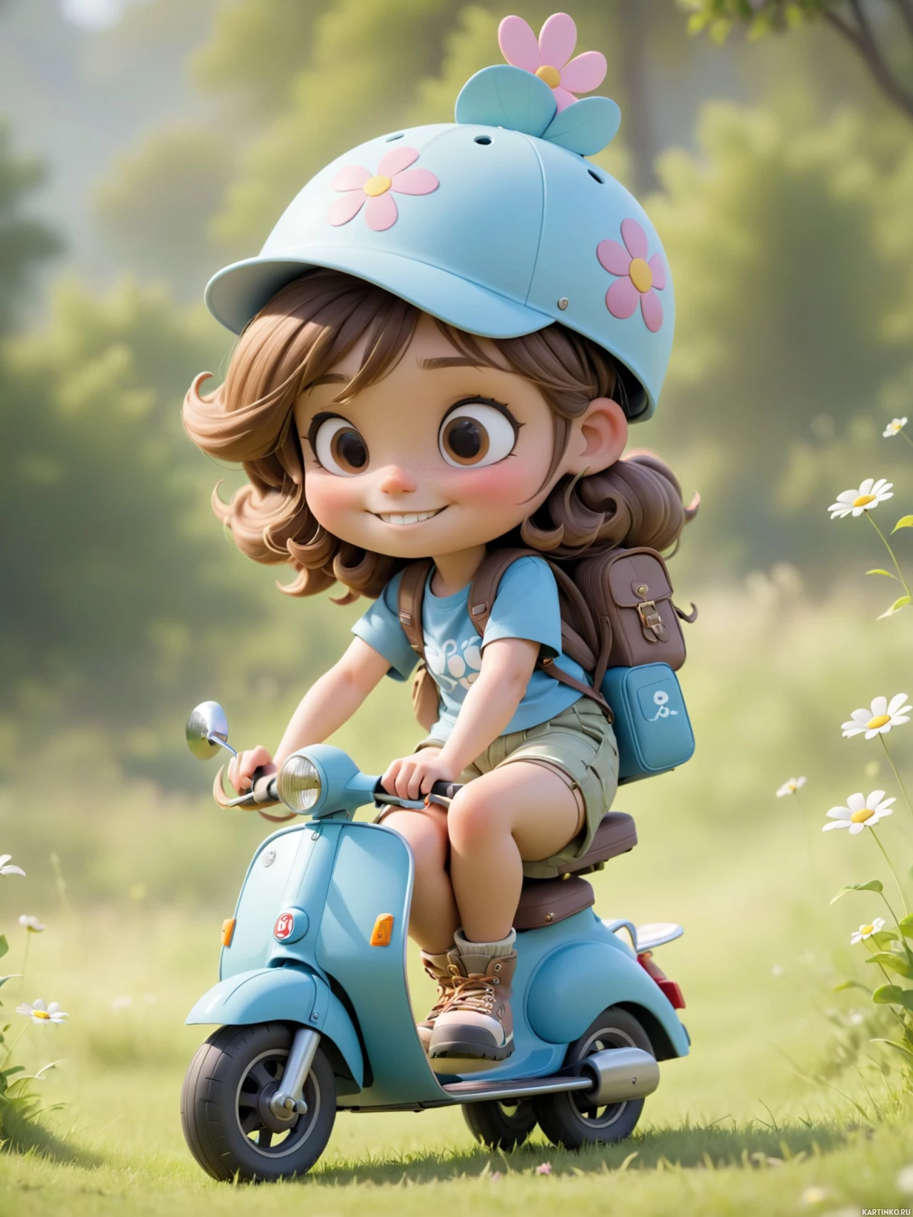 На картинке девочка сияет улыбкой. У неё светлые волосы, а на шлеме, кажется, закреплены розовые цветы. Она в рюкзаке и сидит на синем мопеде. На заднем плане виднеется пышная зелень, похожая на лес или сад, с деревьями и цветами вокруг мопеда.