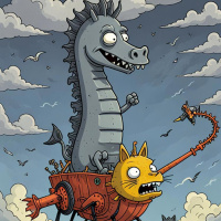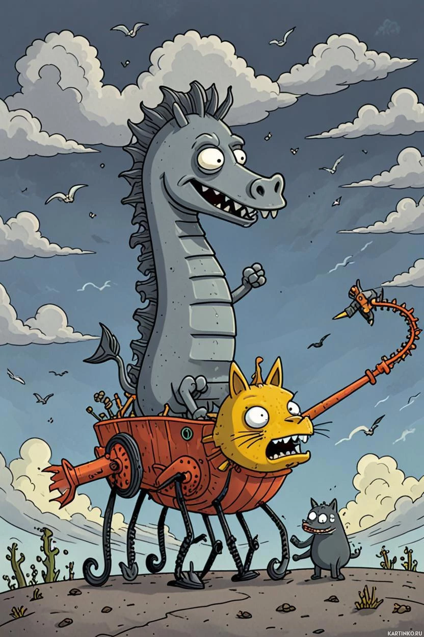 На картинке три главных героя. Слева — дракон с синим телом и жёлтыми крыльями, восседающий на красном ведре. Дракон, похоже, мужского пола и одет он без одежды. В середине — рыжий кот, сидящий в ведре. Эта кошка также кажется женского пола и без одежды. Справа — робот-пёс с механическими ногами, стоящий на задних лапах рядом с ведром. У робота-пса нет видимого пола, и он тоже без одежды. На заднем плане — ещё два кота: жёлтый и белый, оба в воздухе, возможно, летают или прыгают. Слева от картинки — дерево с зелёной листвой, а над ними — голубое небо, полное облаков. Вся сцена создаёт ощущение сказочного или причудливого мира.
