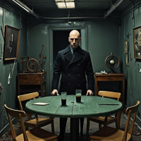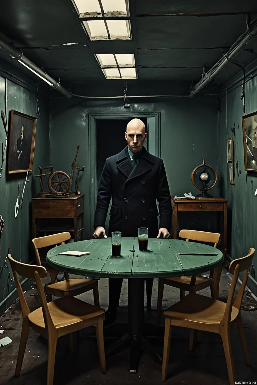 Картинка показывает интерьер, пронизанный мрачной атмосферой. В центре комнаты стоит мужчина в черном пальто и со бритой головой, смотрящий прямо в камеру. Он расположен между двумя деревянными креслами, по одному с каждой стороны, создавая симметричную композицию. Слева в кадре – письменный стол с открытым ящиком, а стены оклеены темными обоями. Над столом на стене висит картина в светлой раме. Общий стиль картинки указывает на то, что она могла быть взята из фильма или телесериала, что подтверждается драматическим освещением и постановочностью сцены.
