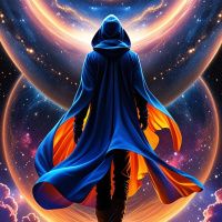 The image features a figure standing on what appears to be a platform floating in space. The individual is facing away from the viewer, looking towards a large celestial body that resembles a planet with rings and a glowing aura around it. The figure is wearing a blue cloak, draped over their shoulders, and a hood is pulled up to cover their face and head. Their arm is extended outward towards the celestial body, suggesting an interaction or connection between them. The background of the image is dominated by swirling clouds and vibrant colors that evoke a sense of otherworldly energy. The style of the artwork is highly detailed and suggests a fantastical or science fiction context.