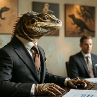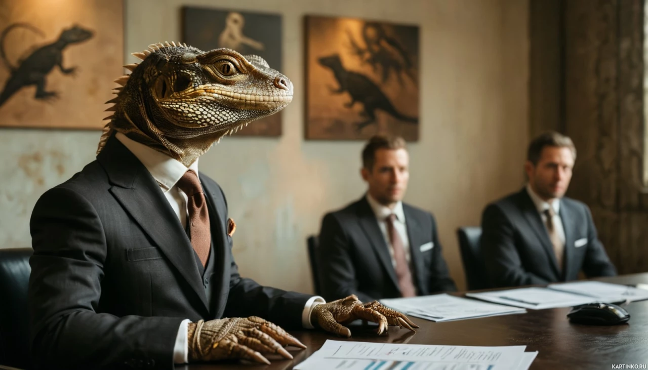 На картинке изображена группа мужчин в переговорной комнате. За столом, на почетном месте, сидит человек в костюме и галстуке, выполненный в образе ящерочеловека – антропоморфного рептилоидного существа, часто встречающегося в фэнтези. Судя по всему, он руководит встречей. За столом также сидят другие участники, одетые в деловой костюм, у некоторых видны галстуки. Комната хорошо освещена, атмосфера формальная, что характерно для деловой обстановки.