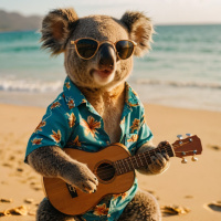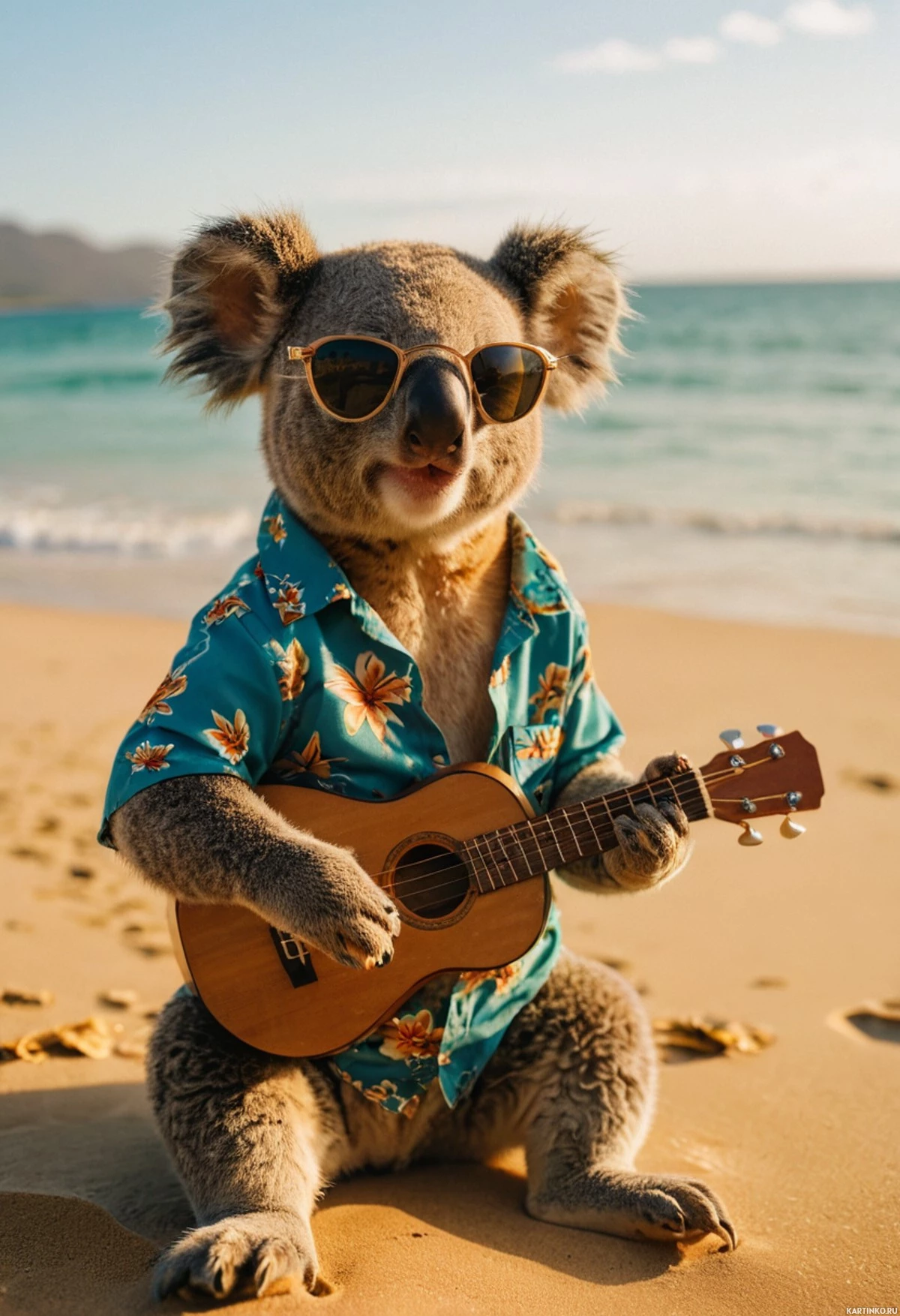 На картинке серый коала сидит на пляже, уверенно поставив ноги в песок. На его мордочке широкая улыбка, а на глазах – солнцезащитные очки. В руках он держит гитару, на которой умело играет обеими руками. На заднем плане – чистое голубое небо и спокойный океан, создающие атмосферу безмятежности.