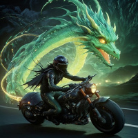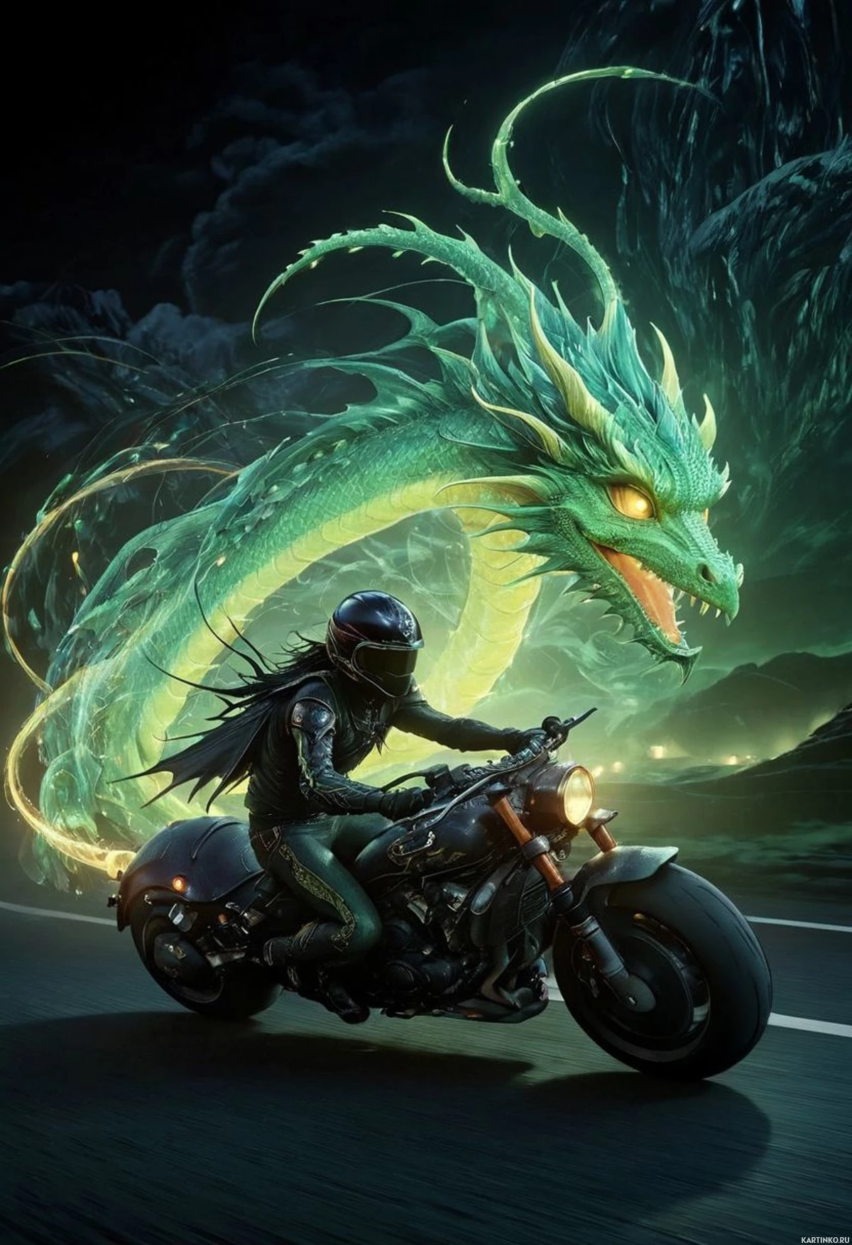 the dynamic posture of the bike. On their left shoulder, they carry what looks like a staff or weapon, adding an element of adventure or fantasy to the scene. The most striking feature is the dragon that emerges from behind the rider. The dragon has