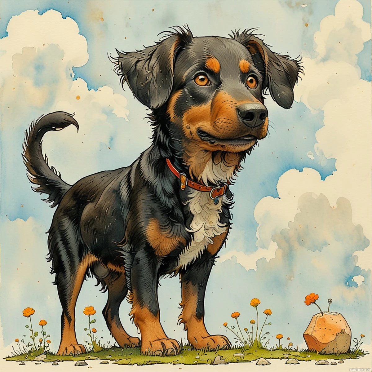 На картинке пес, чёрно-рыжий с висячими ушами, стоит на четвереньках на переднем плане. Его взгляд направлен в сторону, словно он что-то заметил за кадром. На заднем плане – ярко-голубое небо с белыми облаками и зелёная трава. У основания картинки несколько оранжевых цветов и скопление камней.