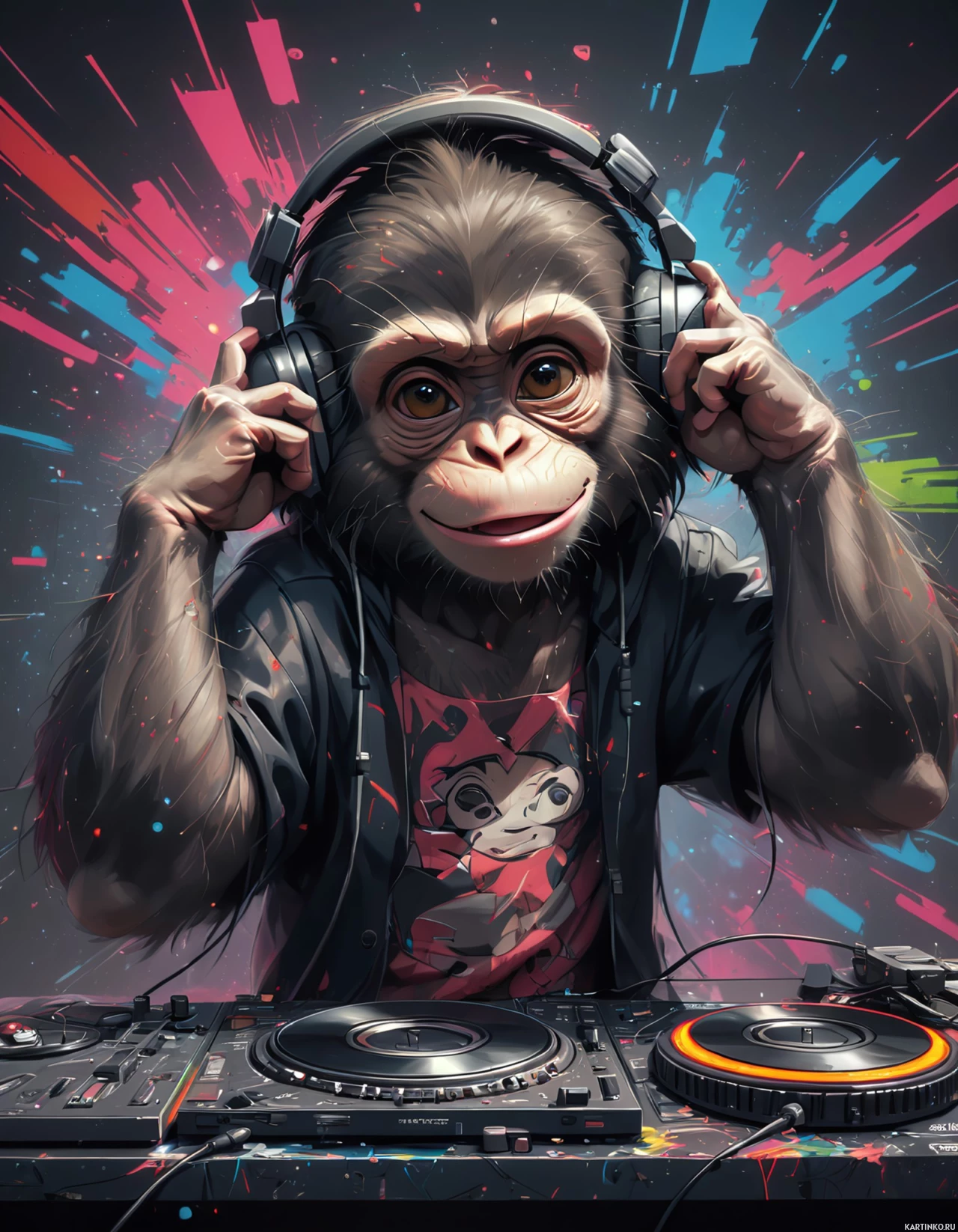 A monkey wearing headphones is DJing with a vibrant background of colorful sound effects radiating from his head.