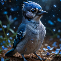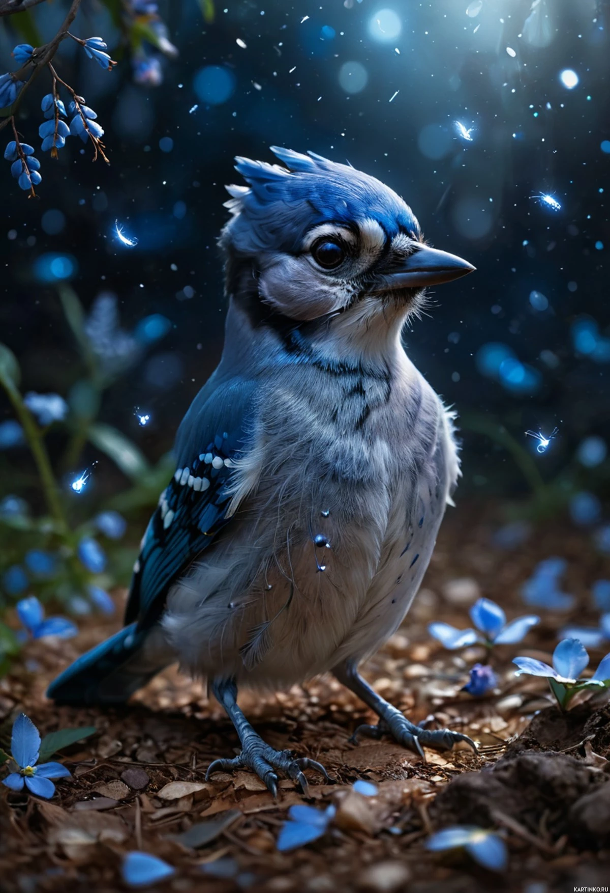 The image features a blue jay perched on a rock with small flowers around it. The bird appears to be looking upwards, possibly observing the night sky which is depicted with stars and a crescent moon. The color scheme includes various shades of blue, white, and black, giving the scene an otherworldly or fantastical atmosphere.