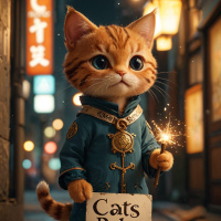 The image depicts a character that appears to be an anthropomorphic orange tabby cat standing on what looks like a street at night, with various signs and lanterns in the background. The character is wearing a blue coat with badges or patches on it and has a whimsical expression on its face. It holds a wand-like object in one paw and a sign that reads "CATS RULES" with an illustration of a cat on the front. There are also what appear to be sparkles around the character's head, suggesting a magical or fantasy element to the scene.