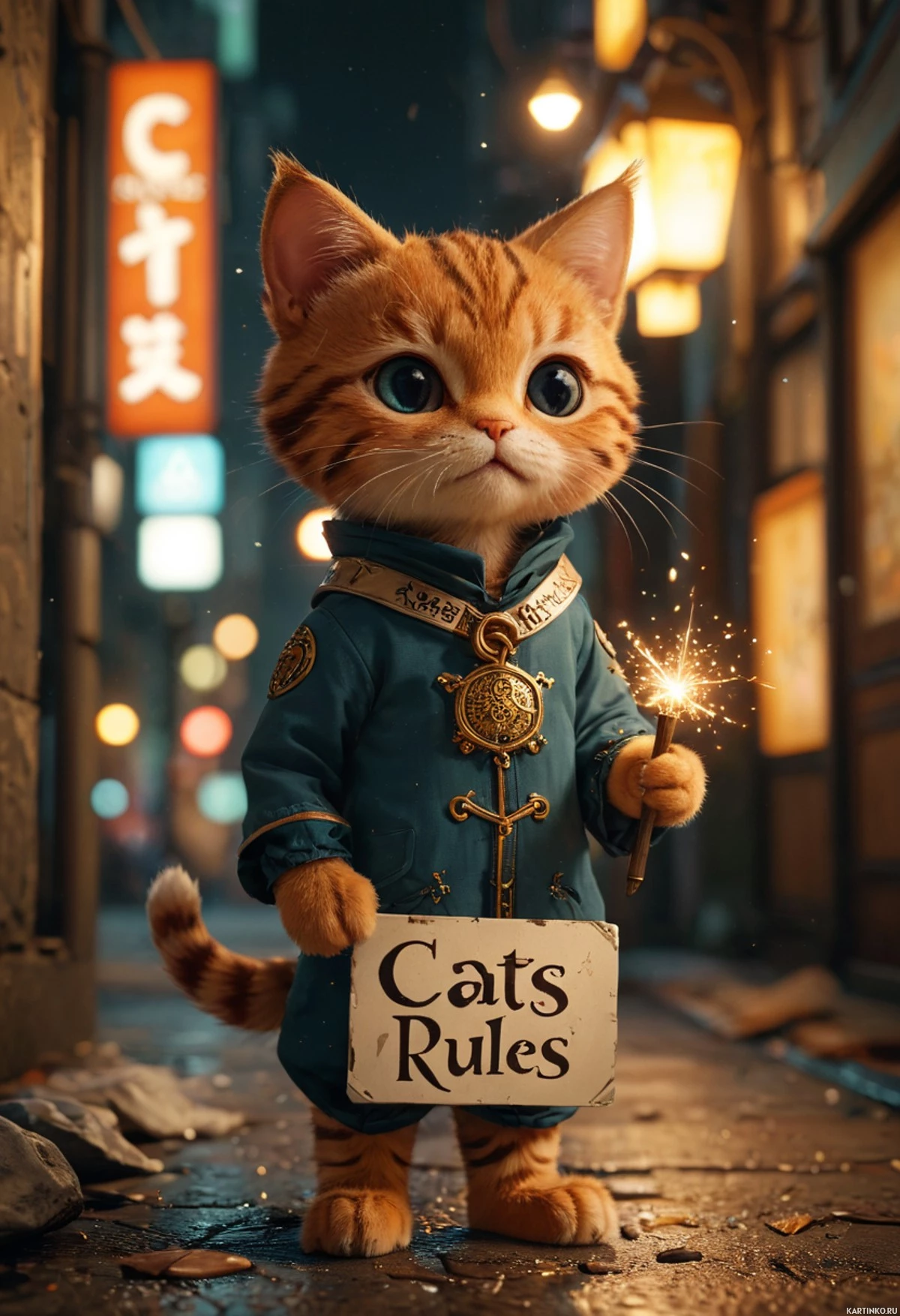 На картинке изображён антропоморфный рыжий котик, стоящий, кажется, на улице ночью. На заднем плане – различные вывески и фонари. На котике – синее пальто, украшенное нашивками и значками, а на мордочке – забавное выражение. В одной лапе он держит нечто похожее на волшебную палочку, а в другой – табличку с надписью "CATS RULES" и рисунком кошки. Вокруг головы персонажа видны искры, создающие ощущение волшебства и сказочности.