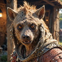 На картинке изображён персонаж в стиле фэнтези, похожий на антропоморфное животное – то есть волка с чертами человека. Существо стоит на двух ногах, принимая человеческую осанку. На нём коричневый жилет или туника, открывающая мускулистую грудь, с виднеющимися ремнями и пряжками, напоминающими доспехи. Вокруг шеи – красный шарф с бахромой. Черты лица скорее человеческие, чем звериные: большие, заострённые уши и морда, переходящая в человеческое лицо со сложенными веками и приоткрытыми губами, будто с оскалом. Шерсть не видна из-за одежды. Фон указывает на открытое пространство с деревянными постройками и чистым небом, что говорит о сцене из фэнтезийного или мифологического мира.