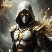 The image features a fantasy warrior standing in front of an ornate archway. The character is adorned with intricate armor and a cloak, with the central focus being on the face which is hidden behind a hood and mask. The armor appears to have golden accents, suggesting a theme of luxury or divine protection. The background reveals dark, misty environments that hint at a mystical or otherworldly setting.