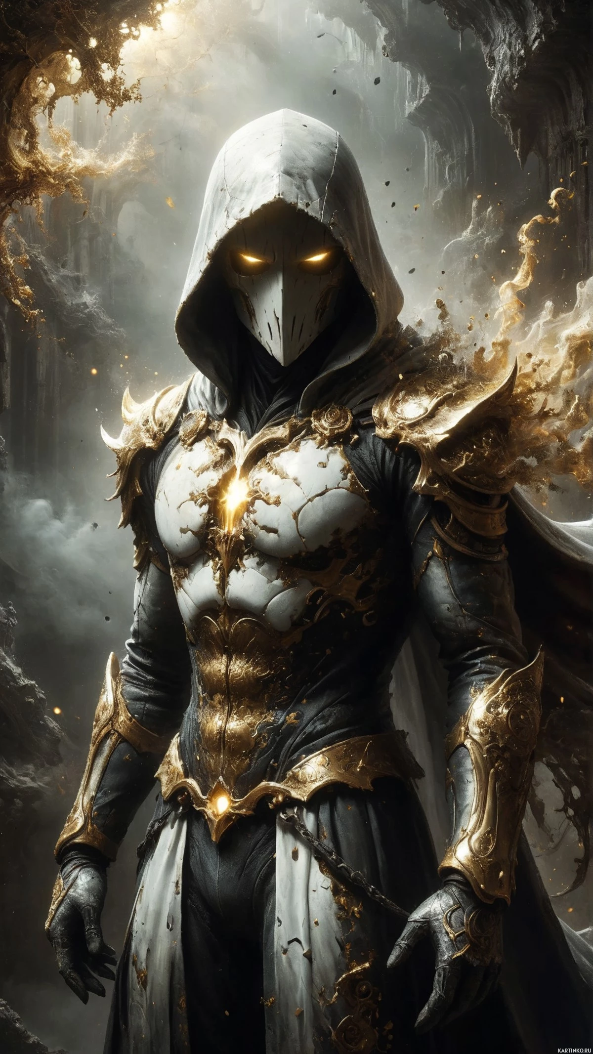 На картинке затейливо оформленная арка, а перед ней стоит воин в фантастическом стиле. Персонаж облачен в сложную броню и накидку, акцент сделан на лицо, скрытое под капюшоном и маской. Броня украшена золотыми деталями, что создает ощущение роскоши или божественной защиты. На заднем плане – мрачные, туманные пейзажи, намекающие на мистическое или потустороннее место.