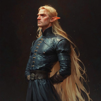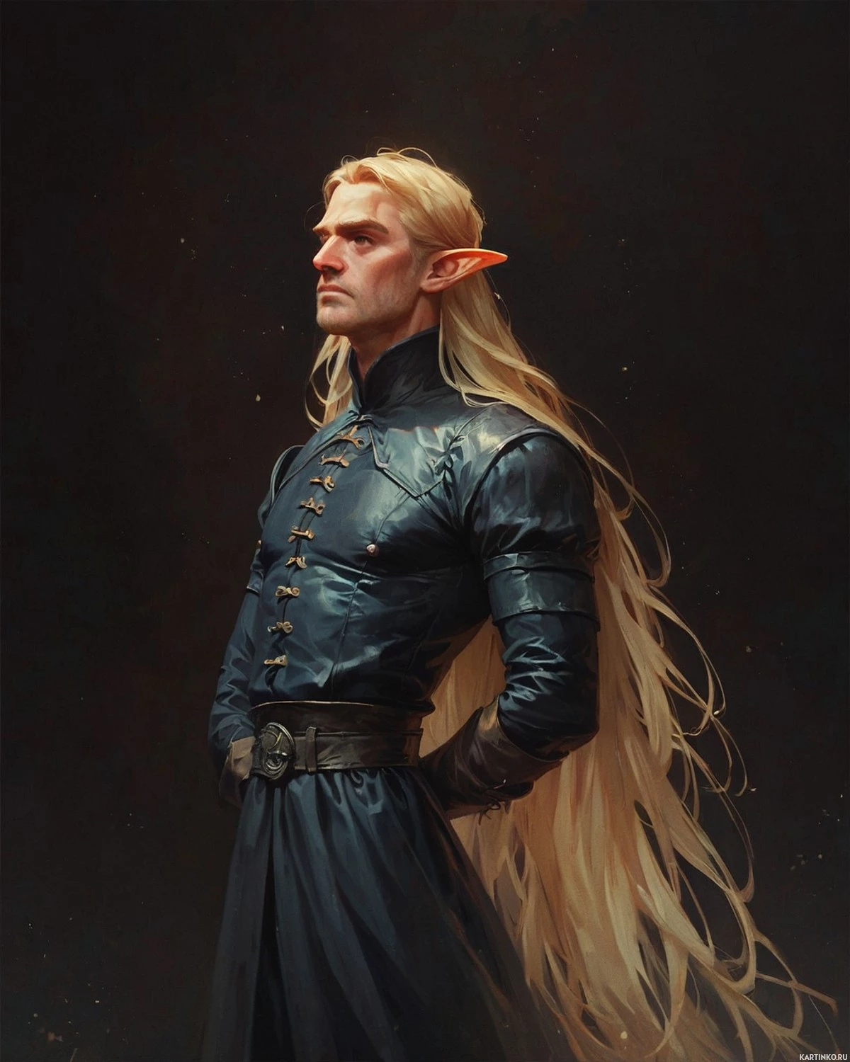 На картинке изображён персонаж с заострёнными ушами, напоминающий эльфа из фэнтезийного мира. У него длинные светлые волосы, спадающие ниже плеч, и он одет в доспехи с голубыми акцентами и подходящими сапогами. На доспехах – сложная золотая отделка, а на плечах – чёрный плащ. Выражение лица персонажа серьёзное, и он смотрит прямо на зрителя. Фон тёмный, что создаёт контраст и подчёркивает фигуру.