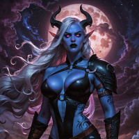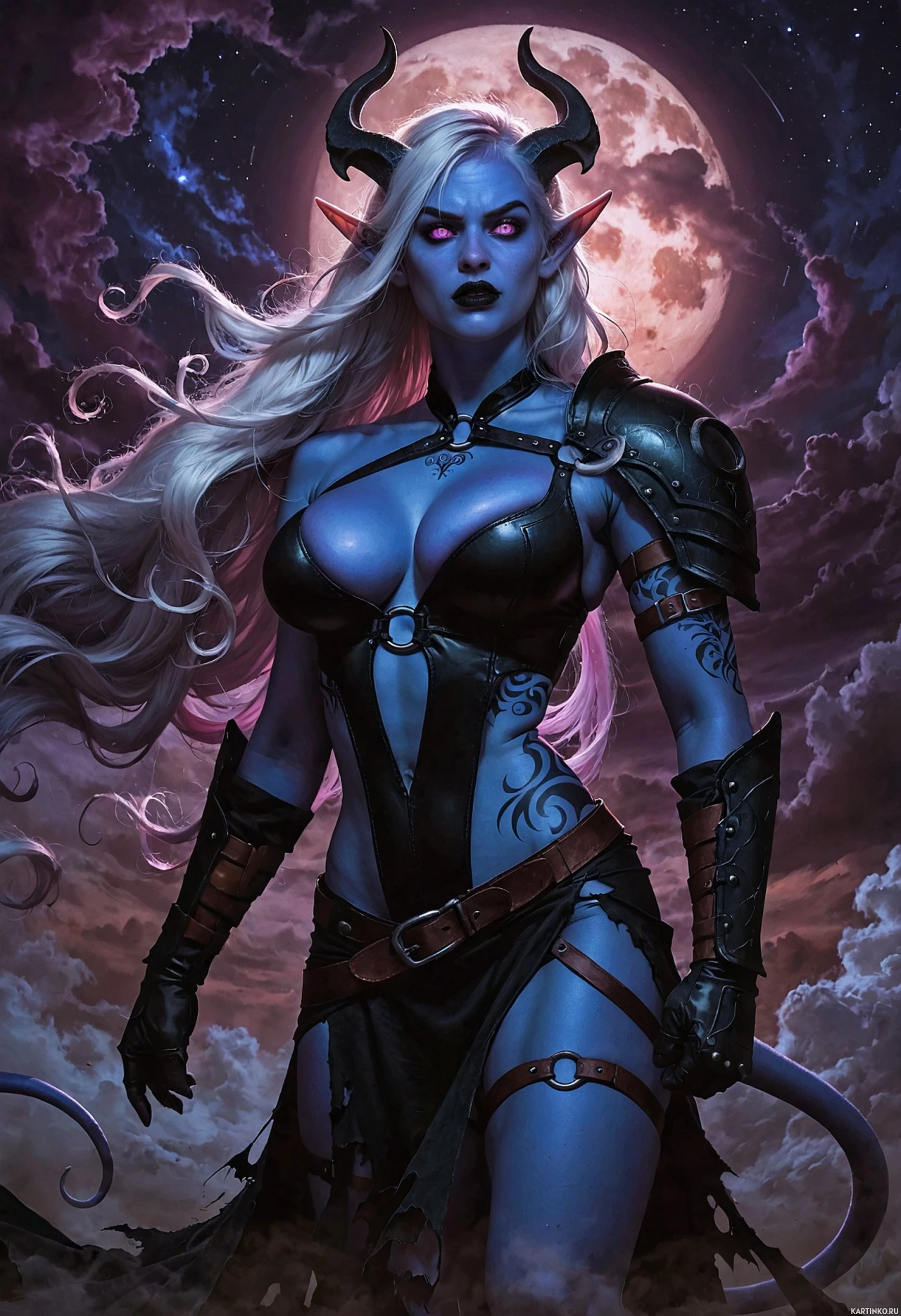 На картинке изображен персонаж в стиле фэнтези с белыми волосами, в темной броне и с оружием в руке. На заднем плане – яркая полная луна, окутанная фиолетовым свечением. Вся работа выполнена в манере, характерной для видеоигр или графических романов.