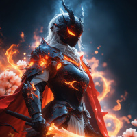The image depicts a fantasy warrior character. Key elements include: - Helmet: A dark, pointed helmet adorned with what appears to be lightning bolts or energy emanating from it. - Fire: There are flames around the armor and weapons of the character, suggesting fire elemental abilities or powers. - Sword: The warrior is holding a sword with designs that could indicate magical properties. - Armor: The character's armor includes plates, straps, and buckles, all crafted to give an impression of strength and protection. - Cloak: A red cape or cloak drapes over the warrior's shoulders, adding a regal or mystical touch to the ensemble. The character is standing upright, and the overall composition suggests a powerful, otherworldly figure capable of wielding fire and lightning as part of their combat abilities.