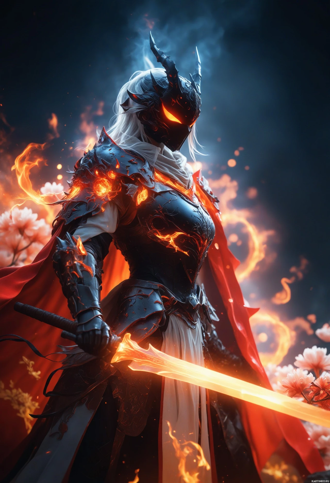 На картинке изображен персонаж, воин из фэнтези. Ключевые детали: - Шлем: Тёмный, заострённый шлем, украшенный, кажется, молниями или исходящей из него энергией. - Огонь: Пламя окружает доспехи и оружие персонажа, что может свидетельствовать о его способности управлять огнём или о наличии огненных сил. - Меч: Воин держит меч, украшенный узорами, которые, вероятно, указывают на его магические свойства. - Доспехи: Доспехи персонажа состоят из пластин, ремней и пряжек, всё создано для придания ощущения силы и защиты. - Плащ: Красный плащ или накидка ниспадает на плечи воина, добавляя ансамблю царственности или мистического настроения. Персонаж стоит прямо, и общая композиция предполагает могущественную, неземную фигуру, способную использовать огонь и молнию в бою.