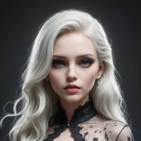 The image features a woman with long blonde hair styled in a way that appears to be fashionable and elegant. She has white hair which is a notable feature of the image as it contributes to her distinctive appearance. Her makeup is done in a style that accentuates her eyes and lips, giving her an intense look. The woman is wearing black lingerie with intricate lace details, including a bodysuit and a corset that appears to be designed for fashion or lingerie modeling. The fabric of the garments has textures that could be described as soft-looking, suggesting high quality materials. Her pose is confident and poised, standing straight with her shoulders back. She holds an expression that seems assertive and self-assured. Her hands are not visible in this crop of the image; however, it's likely they are placed near her body. The background is dark and unadorned, which helps to draw focus to the woman as the central subject of the photograph. The lighting on the woman suggests she is well-lit by artificial lights, likely in a professional studio setting for modeling purposes.