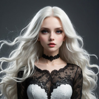 На картинке изображена женщина с длинными белыми волосами, собранными в сложную прическу, украшенную темными декоративными элементами. Ее макияж отличается детализацией: смоки-айз и стилизованные губы создают драматический эффект. На ней черно-белый боди с кружевными акцентами на плечах и груди. Боди имеет корсетную конструкцию на талии и украшен сложной кружевной отделкой, в том числе, похоже, воланом в центре груди. Она держит спину прямо и смотрит в камеру с нейтральным выражением лица. Фон однотонный и не отвлекает внимание от ее наряда.