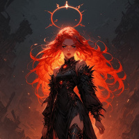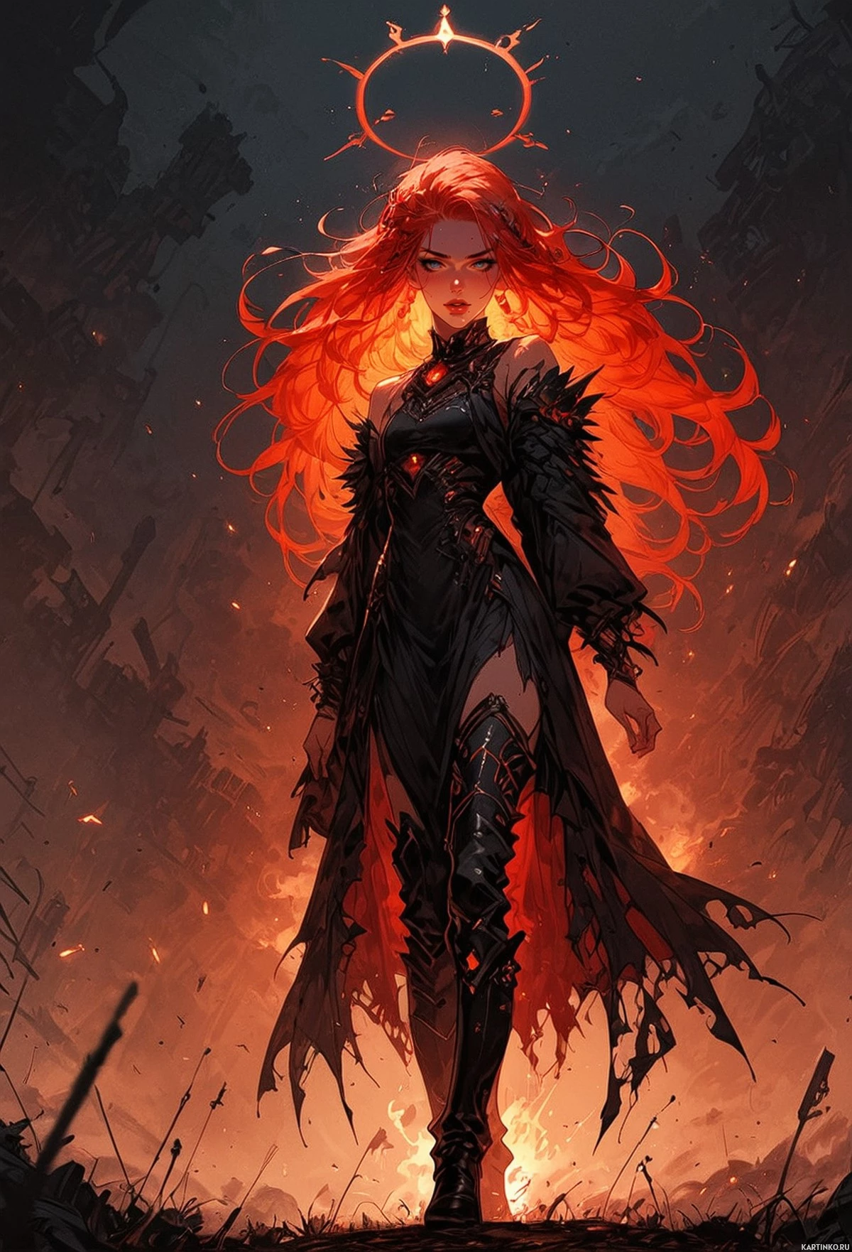 На картинке изображена женщина с рыжими волосами, выделяющаяся в центре. У нее спортивное телосложение, и она одета в сложный доспех из черного металла или пластика, украшенный шипами и заклепками. Доспехи указывают на фантастическую или научно-фантастическую тематику. На заднем плане – драматический пейзаж с извержениями вулканов или огнем, создающий атмосферу хаоса или напряжения. Стиль картинки иллюстративный и напоминает произведения высокого или темного фэнтези.