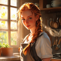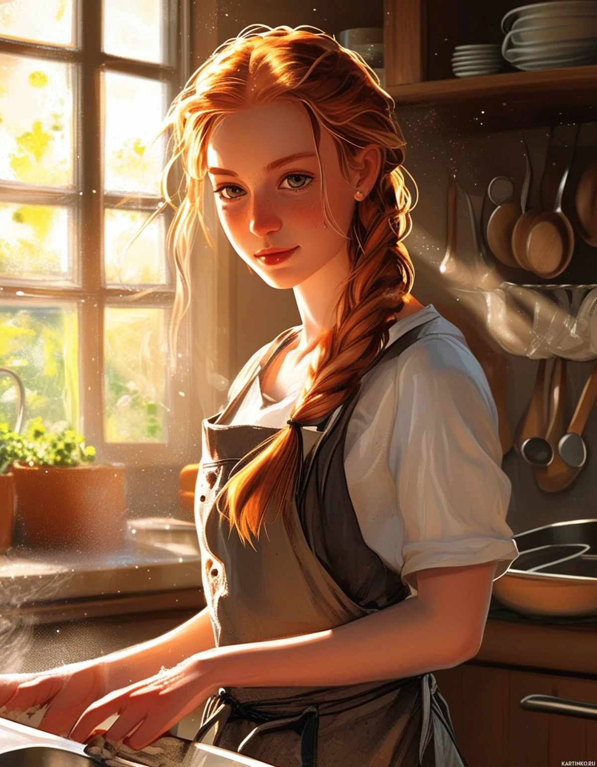 На картинке запечатлена молодая женщина с рыжими косичками, стоящая у кухонного стола. На ней фартук поверх светлой блузки. Она держит, кажется, буханку хлеба и смотрит прямо в камеру с легкой улыбкой. За ней видны деревянные шкафчики и полки, на которых расставлены кухонные принадлежности, посуда и горшки с растениями, добавляющие уюта в интерьер. Свет говорит о том, что на улице солнечный день, и в комнате мягкие тени.